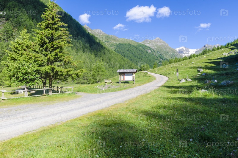 Летний Альпийский пейзаж в северной Италии. Проселочная горная дорога