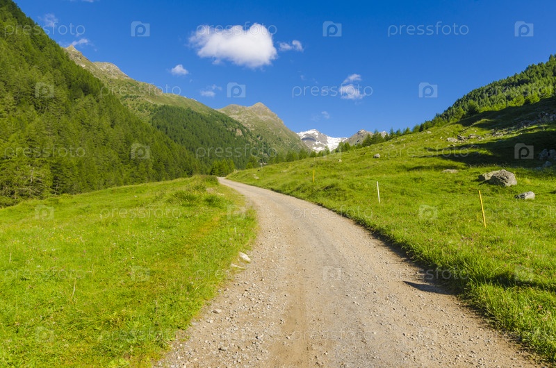 Летний Альпийский пейзаж в северной Италии. Проселочная горная дорога