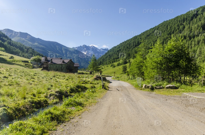 Летний Альпийский пейзаж в северной Италии. Проселочная горная дорога