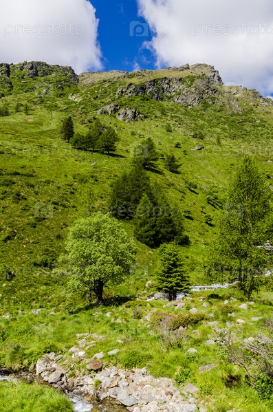 Летний Альпийский пейзаж в северной Италии. Проселочная горная дорога