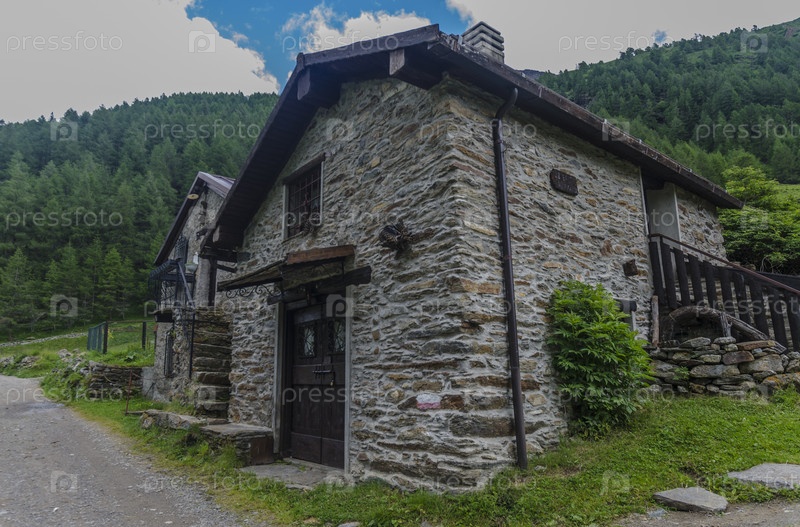 Альпийская деревняю Каменные домики в горах