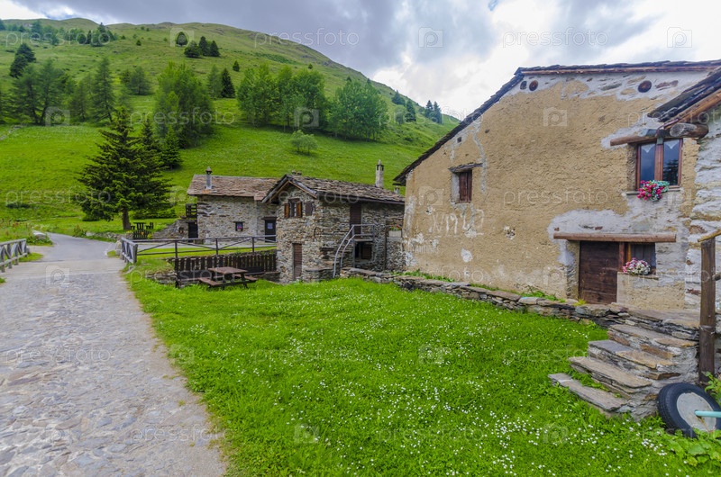 Альпийский пейзаж. Каменные домики в альпийской пастушьей деревне