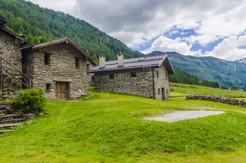 Альпийский пейзаж. Каменные домики в альпийской пастушьей деревне