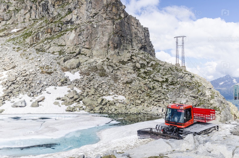 Бульдозер для расчистки снежных трасс вершине гор в Альпах летом