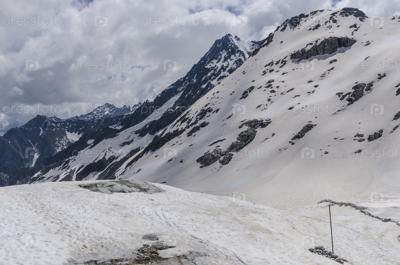 Таящий снег на вершине гор в Альпах летом