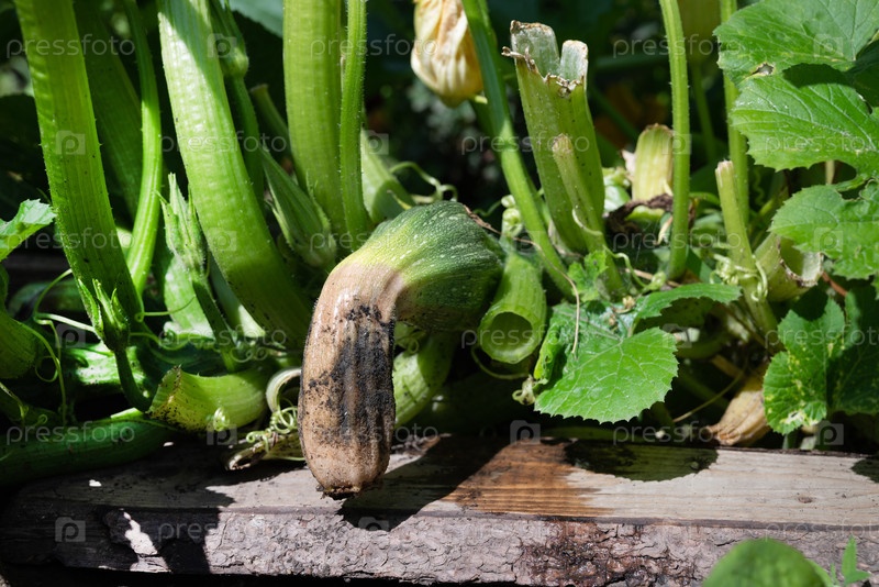 Овощной сад, показывающий больные кабачки с необычным ростом вблизи здоровых растений в середине лета