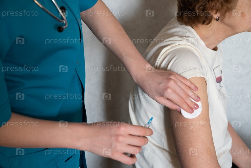 Медсестра готовится дать вакцину пациенту в медицинском учреждении. У пациента на руке повязка от предыдущей инъекции, и атмосфера спокойная