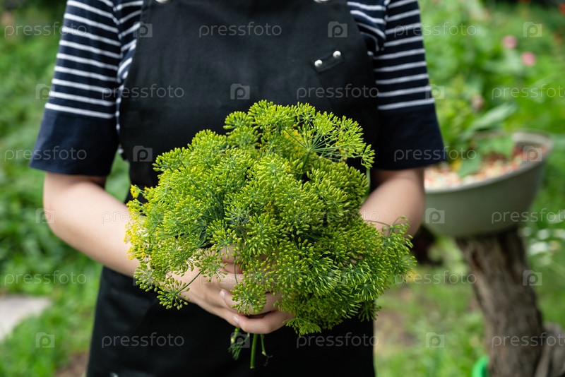 Человек, держащий яркий букет свежих зеленых трав в пышном саду в солнечный день
