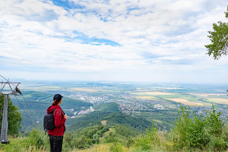 Женщина-путешественница стоит на горной тропе, глядя на лесистые холмы