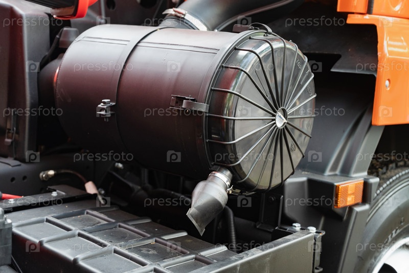 Закрытие корпуса воздушного фильтра грузовика и выхлопной трубы в механической системе. Промышленная установка с металлическими и пластиковыми деталями