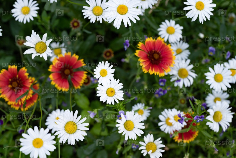 Яркие белые ромашки цветут обильно в солнечном саду весной, демонстрируя их яркие желтые центры