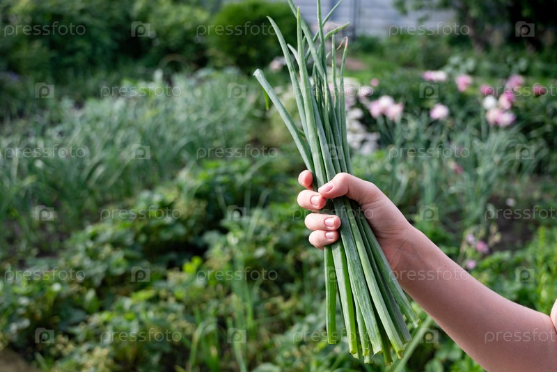 Рука захватывает кучу свежесобранного зеленого лука в цветущем саду, наполненном различными растениями и цветами в весенний период