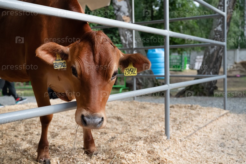 Две коричневые коровы жуют сено на кормушке, вид крупным планом. Наружная ферма с зеленым ограждением видна на заднем плане. Сельская жизнь
