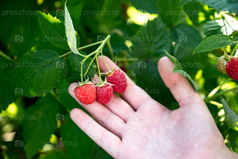 Выбирая спелую малину из пышного зеленого сада во время летнего урожая