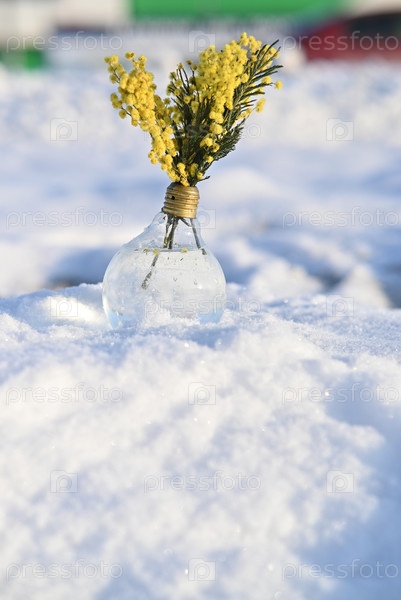 Желтые цветы в лампочной вазе, помещенной на снегу в солнечную зимнюю сцену