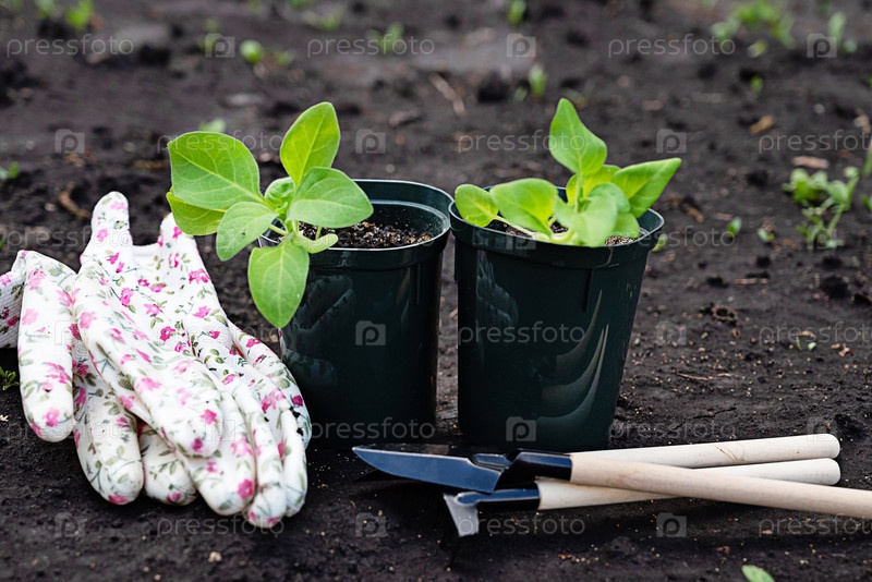 Инструменты для садоводства и свежие саженцы, приготовленные для посадки в садовую кровать в солнечный день