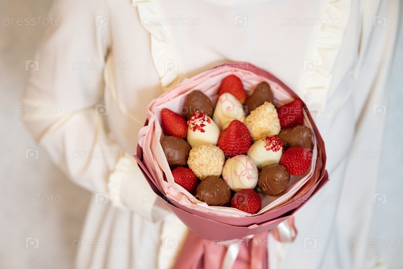 Вкусный букет с шоколадом и клубникой держит человек в стильной обстановке