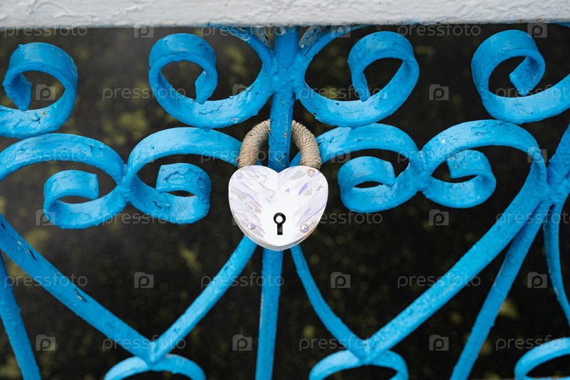 Сердечный замок на заборе на фоне других замков, воды, бетонного покрытия
