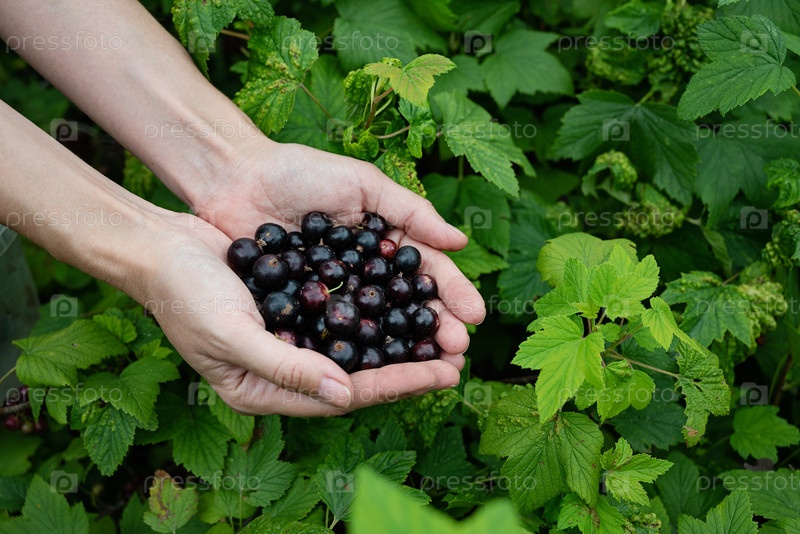 Руки, держащие свежесобранную черную смородину на пышном зеленом фоне в саду