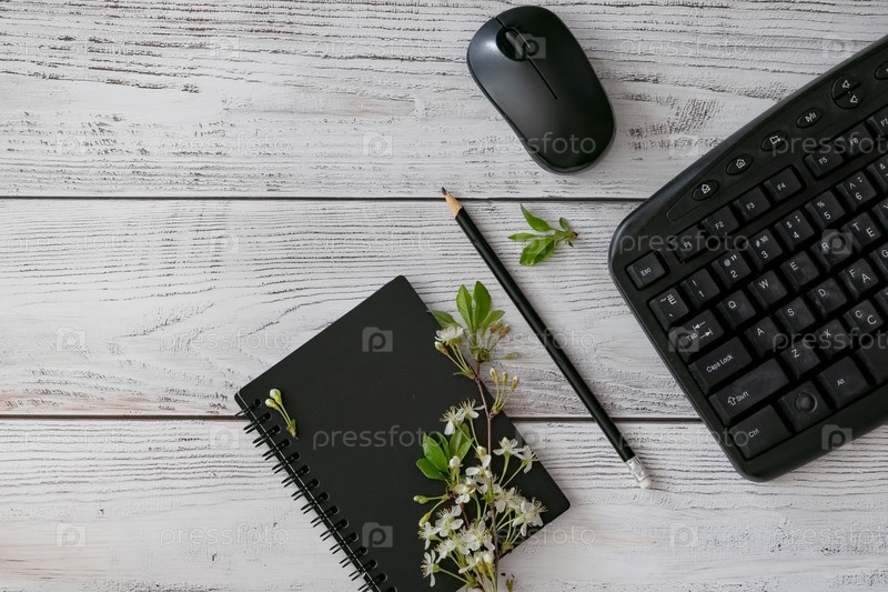 Уютное рабочее пространство имеет черный ноутбук с карандашом, чашку кофе на белой блюдце и нежные цветы, а также компьютерную клавиатуру и мышь на деревянном столе