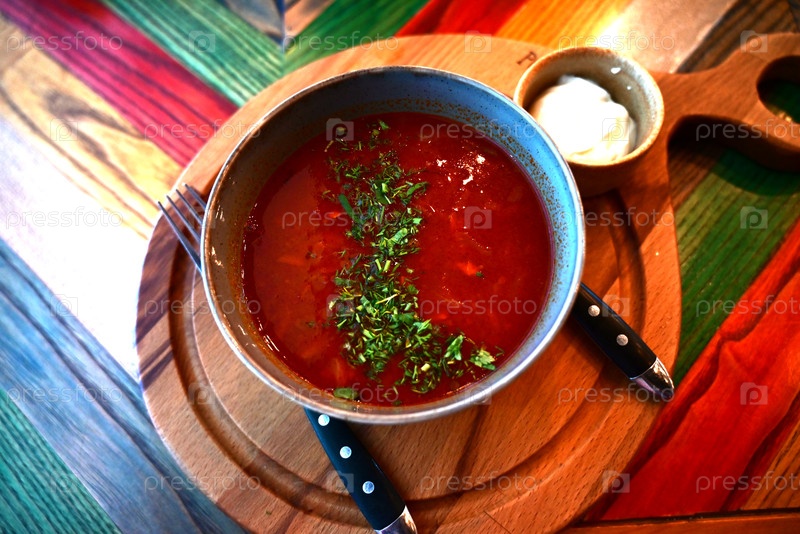 Толстый и сытный красный суп сидит в чаше, увенчанной свежими травами, рядом с небольшим блюдом из сливок. Красочный фон ресторана добавляет привлекательной атмосферы