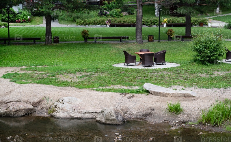 Наружная плетеная мебель установлена со столом на ручье в пышном саду
