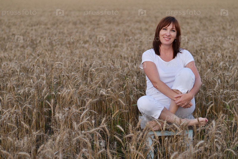 Женщина медитирует, сидя скрестив ноги на золотом пшеничном поле в часы заката, чтобы почувствовать мир и спокойствие