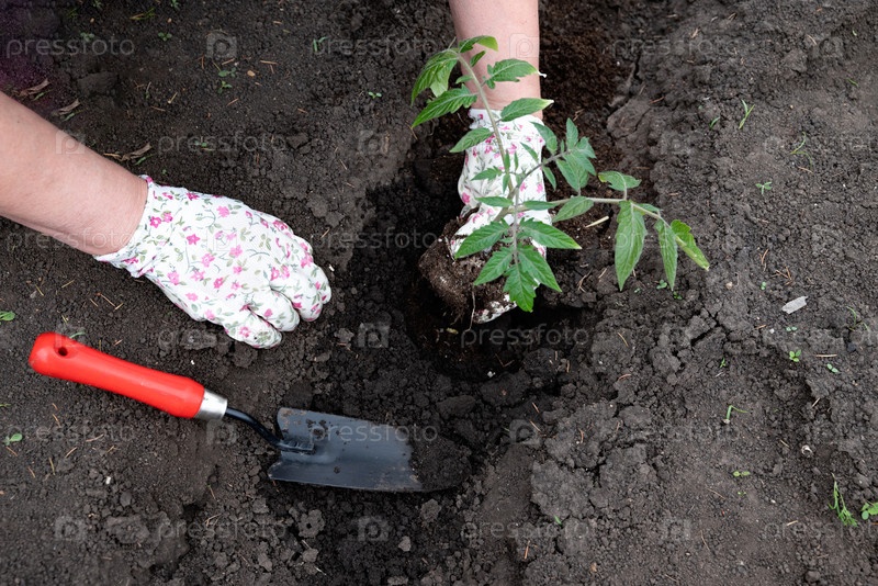 Человек в цветочных перчатках аккуратно помещает в землю молодое помидорное растение, окруженное богатой почвой. Солнечный свет создает теплую атмосферу для садоводства