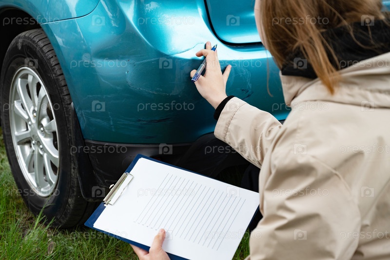 Человек, осматривающий повреждение бампера автомобиля с помощью буфера на открытом воздухе