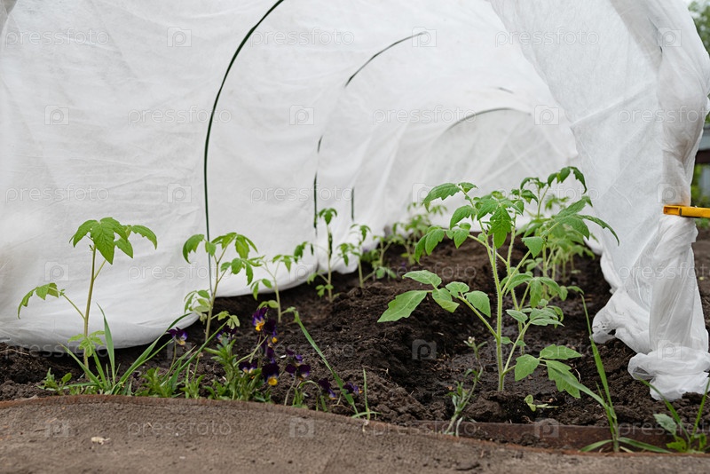 Маленький сад с молодыми томатными растениями, покрытыми защитной тканью на сельском заднем дворе в начале весны