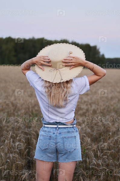 Молодая женщина наслаждается беззаботным моментом на пшеничном поле возле леса во время заката