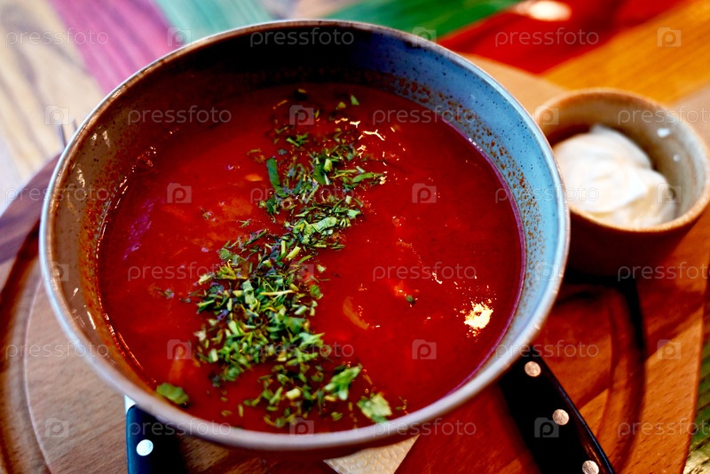 Вкусная чаша красного супа, украшенная травами, подается со сливками в яркой обстановке ресторана