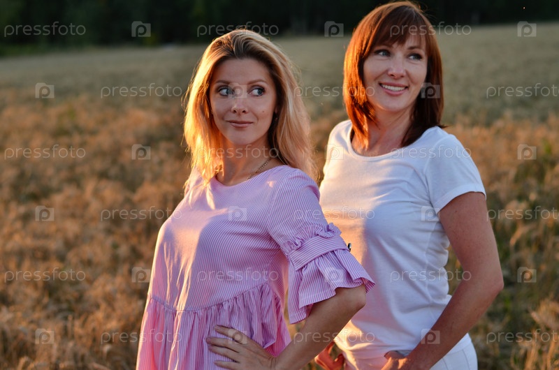 Две женщины наслаждаются радостным моментом на золотом пшеничном поле во время заката, надев яркие летние наряды в сельской местности