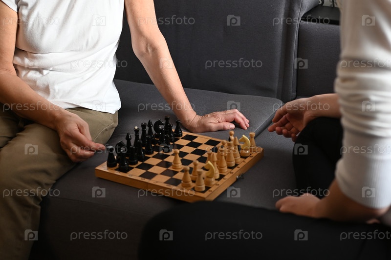 Бабушка и внучка-подросток с энтузиазмом играют в шахматы на уютном диване, демонстрируя стратегию и концентрацию в уютной обстановке гостиной