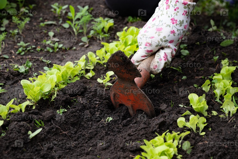 Человек работает в саду, используя ручной инструмент, чтобы ухаживать за молодыми растениями салата в богатой почве. Перчатки защищают руки во время садоводства на теплом весеннем солнце