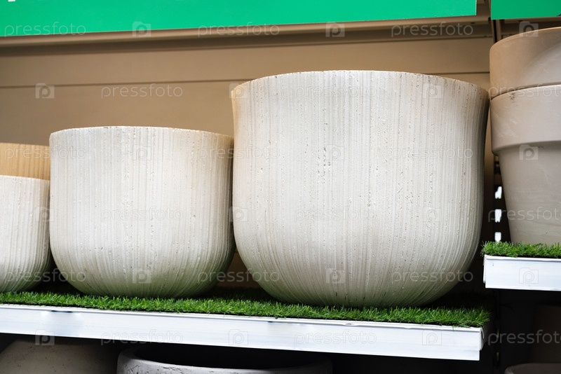 Текстурированные каменные плантаторы выставлены на полках в садовом магазине