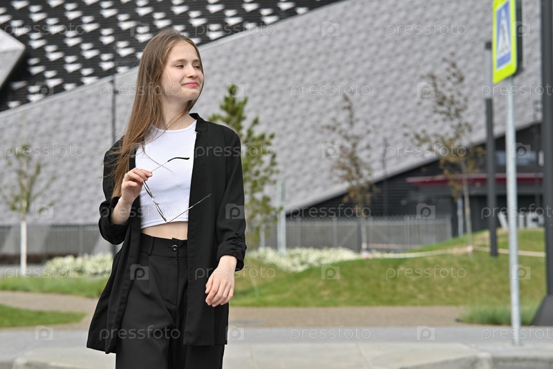Девушка стоит возле пешеходного перехода, держа в руках телефон с современным зданием на заднем плане