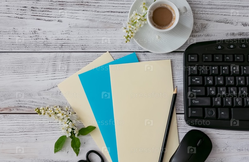 Настройка рабочего пространства с кофейной чашкой, ноутбуком, карандашом и клавиатурой на деревянном столе