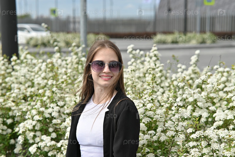 Женщина с улыбающимися солнцезащитными очками, стоящая возле цветущих белых цветов на парковке. Яркая уличная сцена, концепция повседневной моды