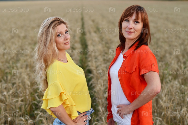 Две женщины, стоят вместе на золотом пшеничном поле во время заката, разделяют момент дружбы и связи