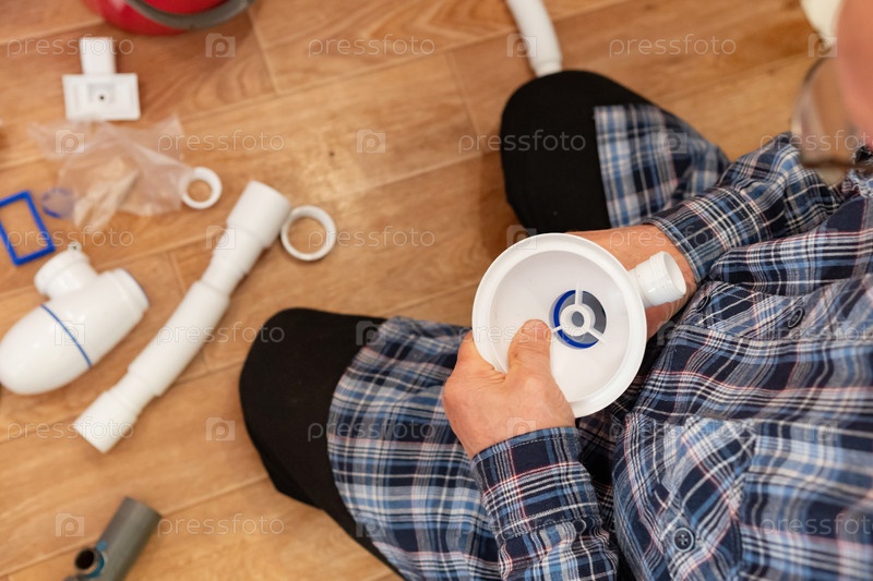 Человек собирает сантехнические приборы, сидя на деревянном полу в проекте реконструкции дома