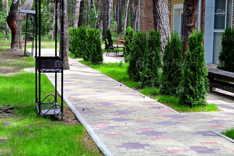 Дорожка через спокойный лес с аккуратно подстриженной зеленью и навесной структурой