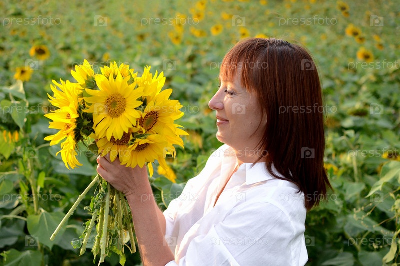 Женщина в белом платье держит яркий букет подсолнухов в солнечном поле в конце дня