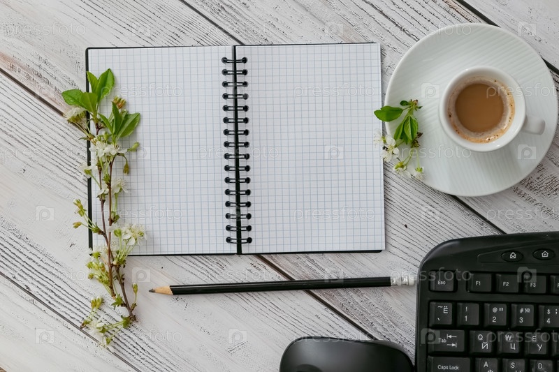 Настройка рабочего пространства с кофейной чашкой, ноутбуком, карандашом и клавиатурой на деревянном столе