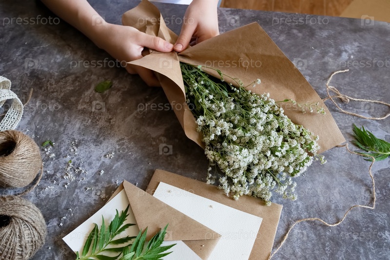 Флорист на работе: симпатичная женщина готовит на сером столе летний букет белой гипсофилы. Крафт-бумага, ножницы, приветственный конверт на столе. Вид сверху. Композиция плоская