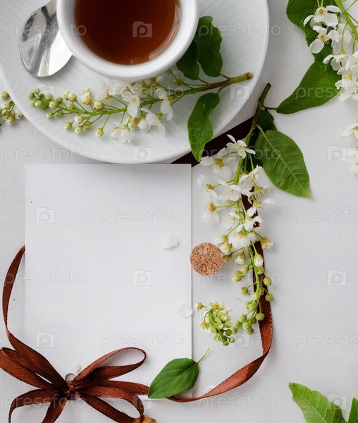 Расслабляющий чай с чашкой травяного чая и свежими цветами на безмятежном белом столе весной