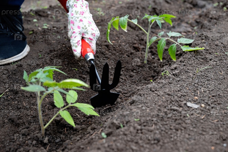 Человек в садовых перчатках использует небольшой инструмент для выращивания почвы вокруг молодых томатных растений в саду на заднем дворе в яркий весенний день