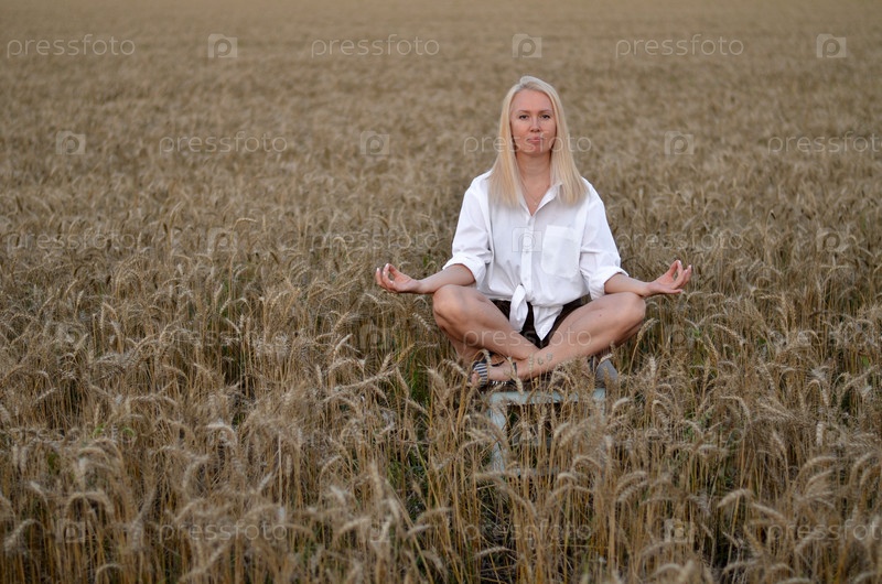 Женщина сидит на золотом поле пшеницы во время заката, демонстрируя природную красоту и спокойствие в сельской местности