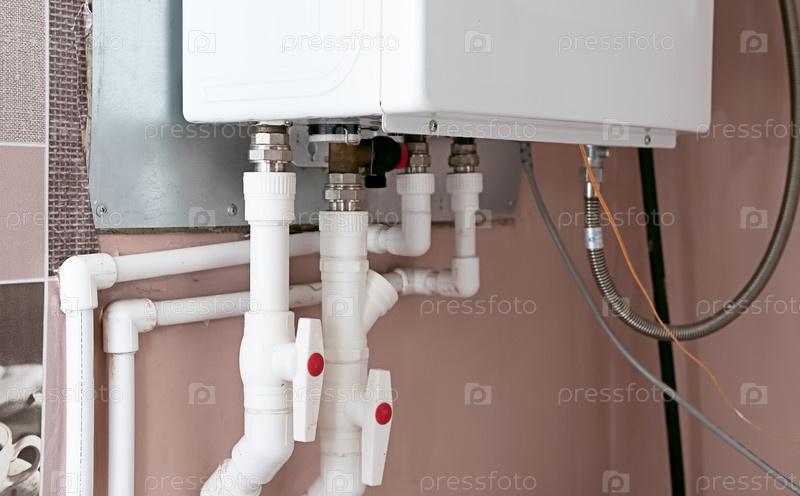На стене установлен современный водонагреватель с белыми трубопроводами и клапанами, которые подключаются к водопроводной системе дома, демонстрируя эффективное управление жилой водой