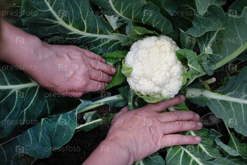 Руки мягко собирают свежую цветную капусту